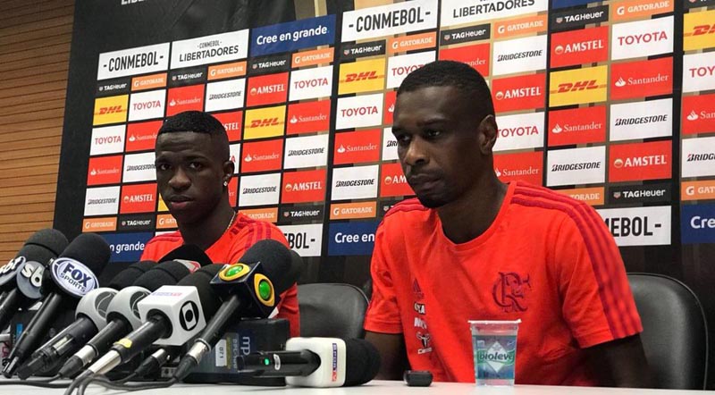 Após o fim das atividades, um encontro de gerações na entrevista coletiva: Juan e Vinicius Junior falaram com a imprensa. Para o zagueiro, o incentivo da torcida é importante.