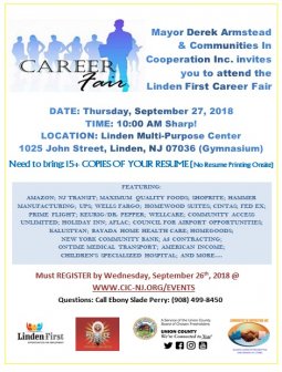 A feira é aberta ao público e espera-se que mais de 25 empregadores participem, incluindo as Escolas Públicas Linden, a NJ Transit, a Amazon, a Dr. Pepper, a FedEx, a ShopRite e muitas outras.