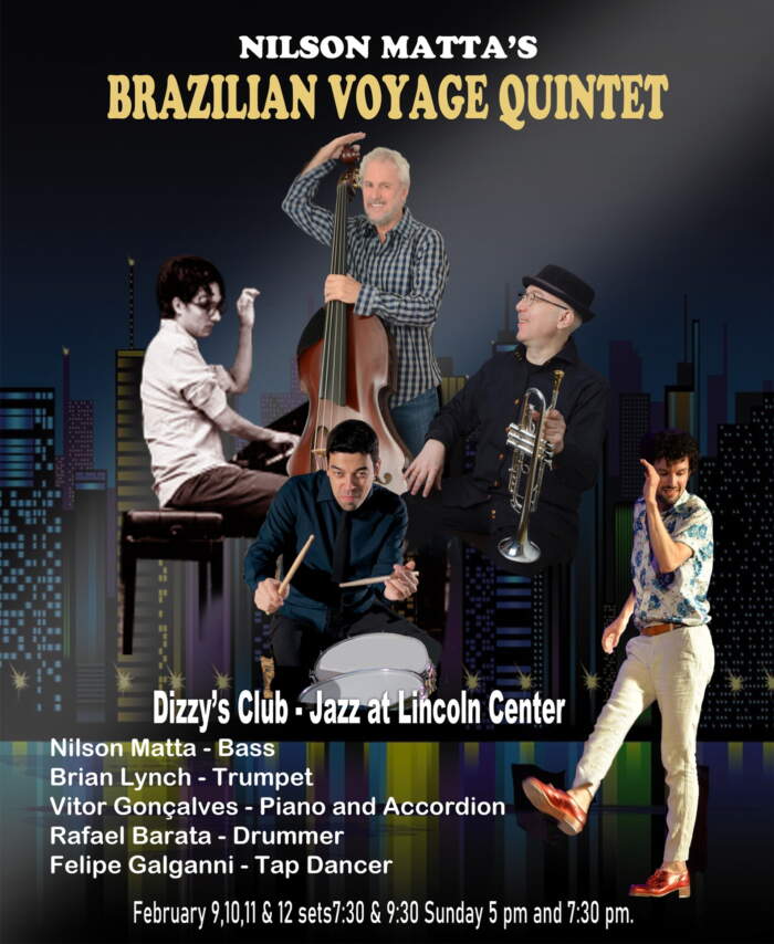 Grammy nominee Nilson Matta is bringing his ensemble band Brazilian Voyage Quintet to Jazz at Lincoln Center, 10 Columbus Circle, February 9-12. The bass master and co-leader of legendary Trio da Paz gathers some exciting instrumentalists for a special program that includes Brian Lynch on trumpet, Vitor Goncalves on piano and accordion, Rafael Barata, drums and tap dancer sensation Felipe Galganni. INFO: https://2023.jazz.org/dizzys-club