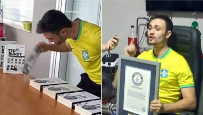 O Guinness World Records compartilhou no último dia 25 um vídeo do brasileiro Renato Bayma Gaia quebrando o recorde de “tempo mais rápido para montar e derrubar 10 livros”.